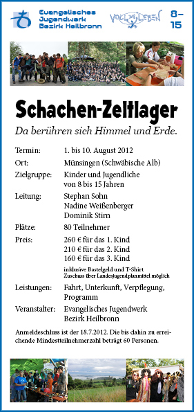 Er enthält nun mehr Fotos, mehr Informationen zum Schachen und zum Zeltlager. Das Anmeldeformular hat an Übersichtlichkeit gewonnen. Die Hinweise und Reisebedingungen wurden gestrafft und auf den aktuellen Stand gebracht. Das Layout passt nun sehr gut zu unserer Website.