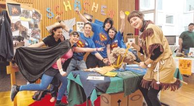 Unser Stand war hübsch dekoriert mit Fotos, T-Shirts und Lagerliederheften. Sven hatte aus dem von Ex-Mitarbeiter Jan gedrehten Schachen-Film einen schönen Schachen-Trailer gebastelt (den ihr Euch auf der Schachen-Website anschauen könnt). Und auch unsere Mitarbeiter hatten sich kreativ in Schale geworfen, wie Ihr nachfolgend sehen könnt: